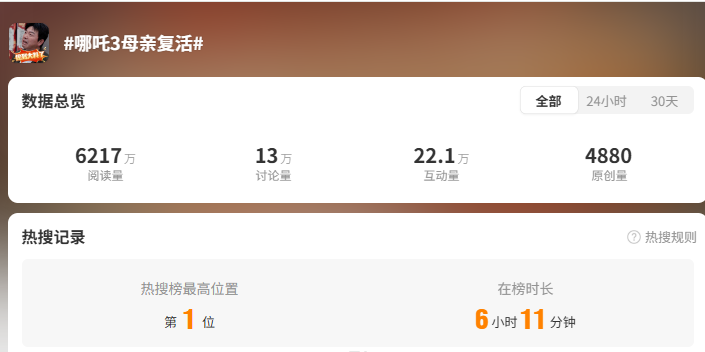 早间,话题“哪吒3母亲复活”迅速冲上新浪微博热搜榜首。截至17时30分,阅读量已超过6200万,讨论量超过13万。